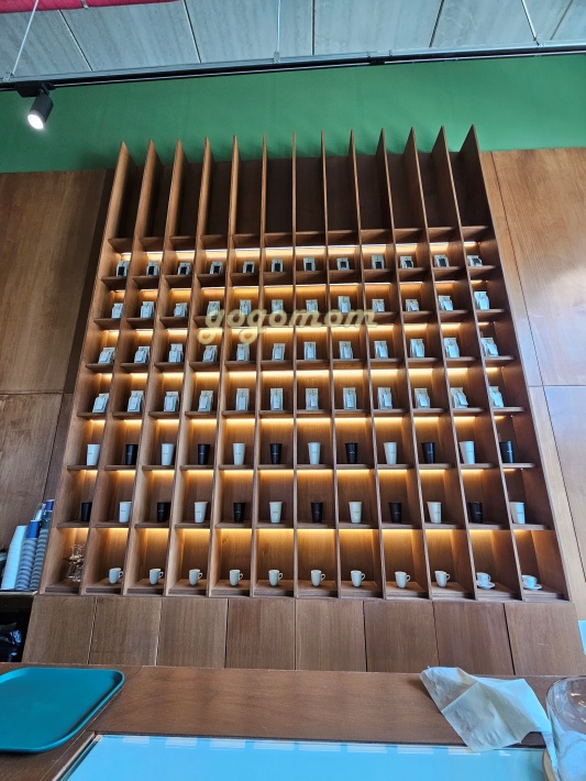 층고가 엄청 높습니다. 원두와 텀블러, 컵을 진열만 해놓아도 인테리어 효과가 나네요.