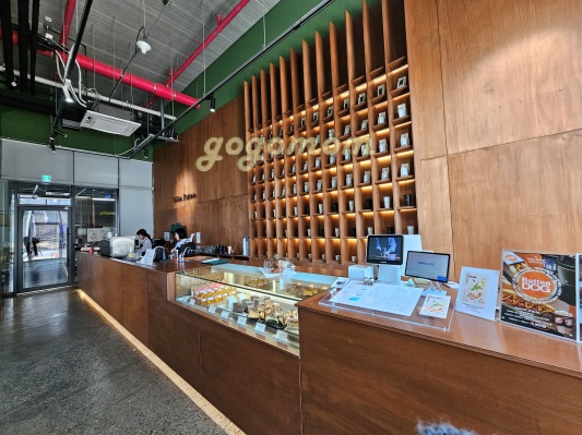 매장에 들어오면 높은 층고를 이용한 인테리어가 압도하는 느낌을 주는데, 위로 쭉 올라가있는 장식장과 옆으로 쭉 뻗어있는 조리대와 주문대가 거대해 보입니다. 끝에 보이는 저 문을 나가면 바로 주차장입니다.
