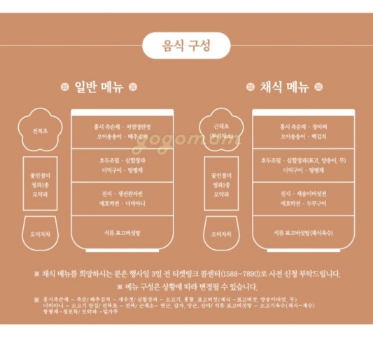 궁중음식 체험에도 일반메뉴,채식메뉴가 따로 있으니 미리 신청을 하는 게 좋겠습니다. 채식메뉴신청은 행사 참여일 3일전까지 티켓링크 콜센터(1588-7890)를 통해 사전 신청을 해야 한다고 합니다.
