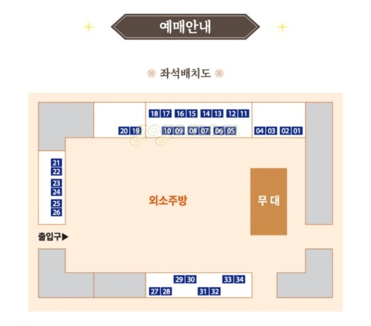 식사 좌석 배치도를 참고하여 예매를 하는게 좋겠습니다. 1회에 34명만 참여할 수 있다고 하니 경쟁이 치열할 것 같네요.