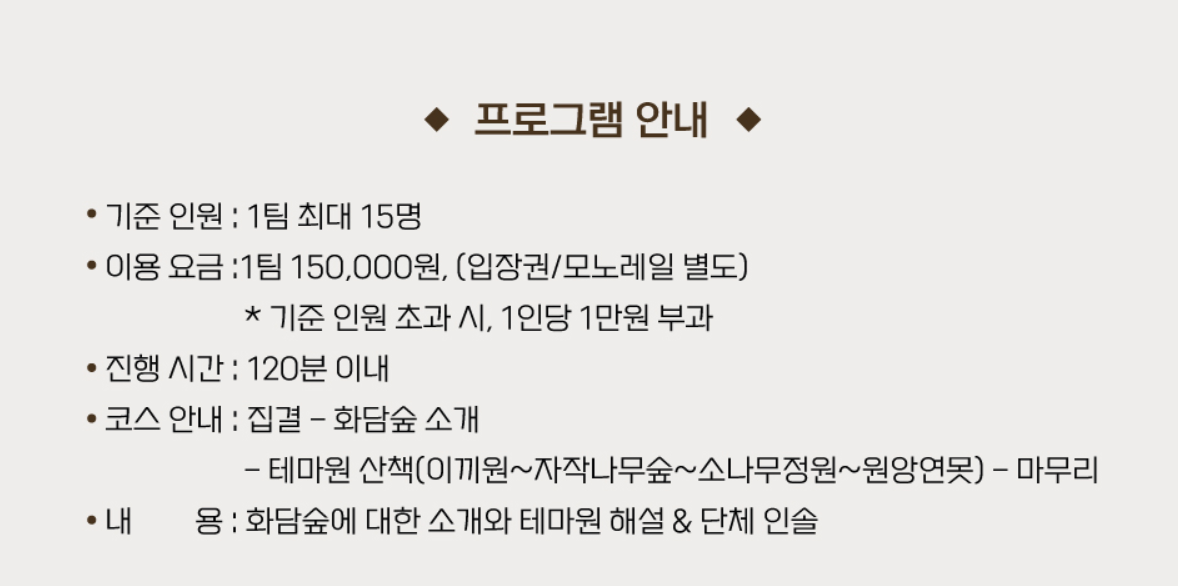- 화담채 관람 소요시간은 약 30~40분입니다. (모노레일 탑승시간을 고려하여 예매해 주세요)