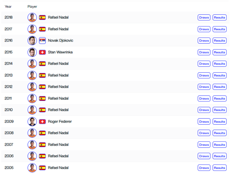 나달이 왜 흙신이라고 불리는지 알 것 같습니다. 라파엘 나달은 롤랑가로스에서만 112승 3패를 기록하고 있습니다. 승률이 무려 97.39%입니다. 하지만 2023년 부상 이후로 예선탈락이라는 부진한 성적을 보여주고 있어서 안타까울 뿐입니다.