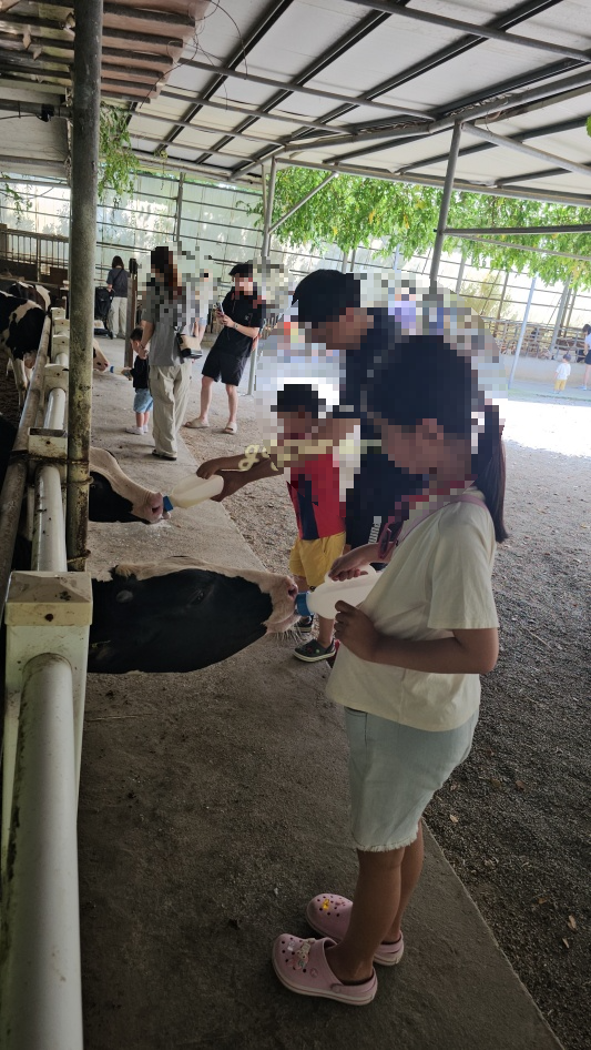 젖 짜기 체험을 하고 그다음은 우유주기 체험이었습니다. 우유통 하나씩 받아서 송아지에게 갔는데 누구 줄지 고민하기도 전에 송아지가 목을 쭉 빼고 기다리고 있어서 빨리 줄 수밖에 없었습니다. 아이들이 처음에 뒷걸음질 치니까 소가 더 목을 빼고 앞으로 와서 불편해 보였습니다. 우유를 순식간에 마셔버렸습니다.